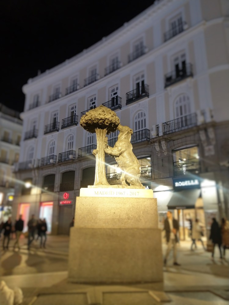 Madryt – plac Puerta del Sol, rzeźba Niedźwiedzia i Drzewa Poziomkowego (symboli miasta) – za ciekawe, nowe miejsce; (marzec)