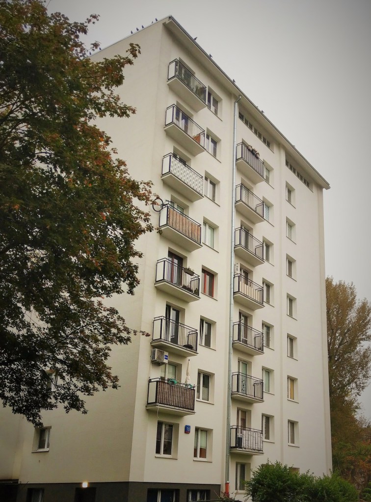 Dzisiaj jeszcze znalazłam kawałek okolicy w najbliższym sąsiedztwie, do którego mogłam dojść i wrócić piechotą. Osiedle Bielany II okazało się jednak kopią pobliskiego Słodowca, co nie dziwne, bo również zostało zaprojektowane przez Piechotków. „Piechotki” jednak już obfotografowałam, a poza nimi niewiele tu jest ciekawego. Do tego złapał mnie deszcz, najpierw była to mżawka, potem kapuśniaczek, a w końcu normalny deszcz jesienny.