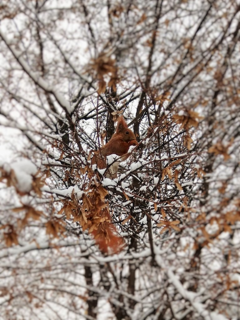 Czuł się bardzo pewnie na tym drzewie i nic sobie ze mnie nie robił, ze smakiem wcinając nasiona lipy.