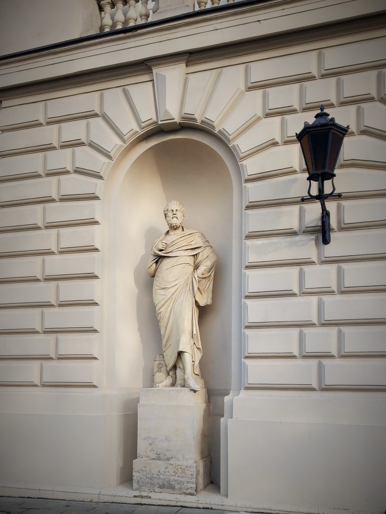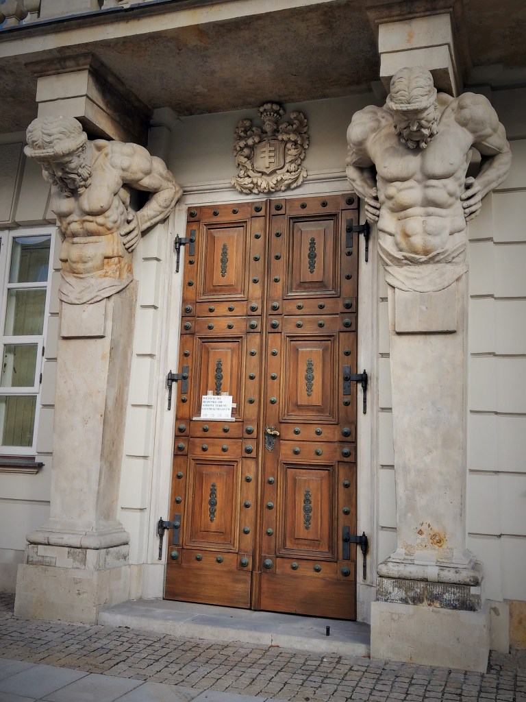 Posilony, student wraca do wytężonej pracy (prawie tak wytężonej, jak tych siłaczy podtrzymujących balkon przed wejściem do Muzeum UW).