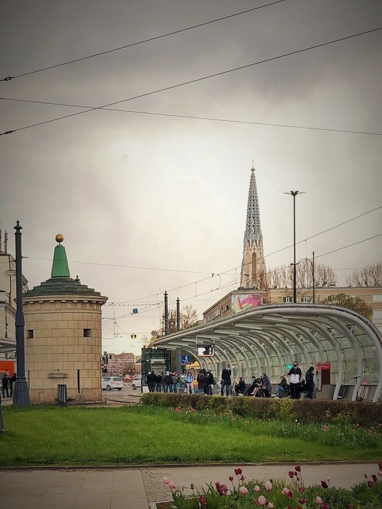 Przystanek typu „2 w 1”, czyli tramwajowo-autobusowy, z wypasioną wiatą i Grubą Kaśką pośrodku. W tle wieża kościoła Ewangelicko-Reformowanego.