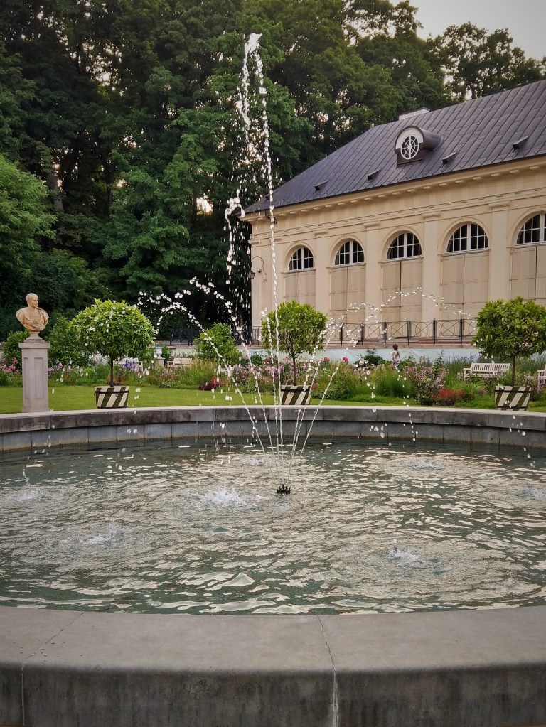 Ogród Królewski to najstarsza, najbardziej reprezentacyjna (i najbardziej oblegana) część Łazienek, założona w XVIII w. Wybrałam się tam wieczorem, po 20.00, kiedy nie było już zbyt wielu odwiedzających. Tematem przewodnim spaceru była woda (jak to w łazienkach). Jest jej tu dużo – w stawach, kanałach, źródełkach, fontannach, a także w kamieniu – szemrząca, pluszcząca, ciurkająca i plumkająca… Po tygodniu morderczych upałów przyniosła prawdziwe ukojenie.