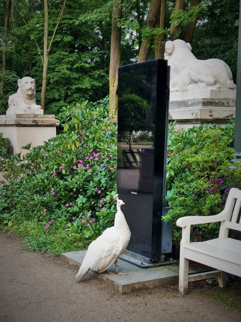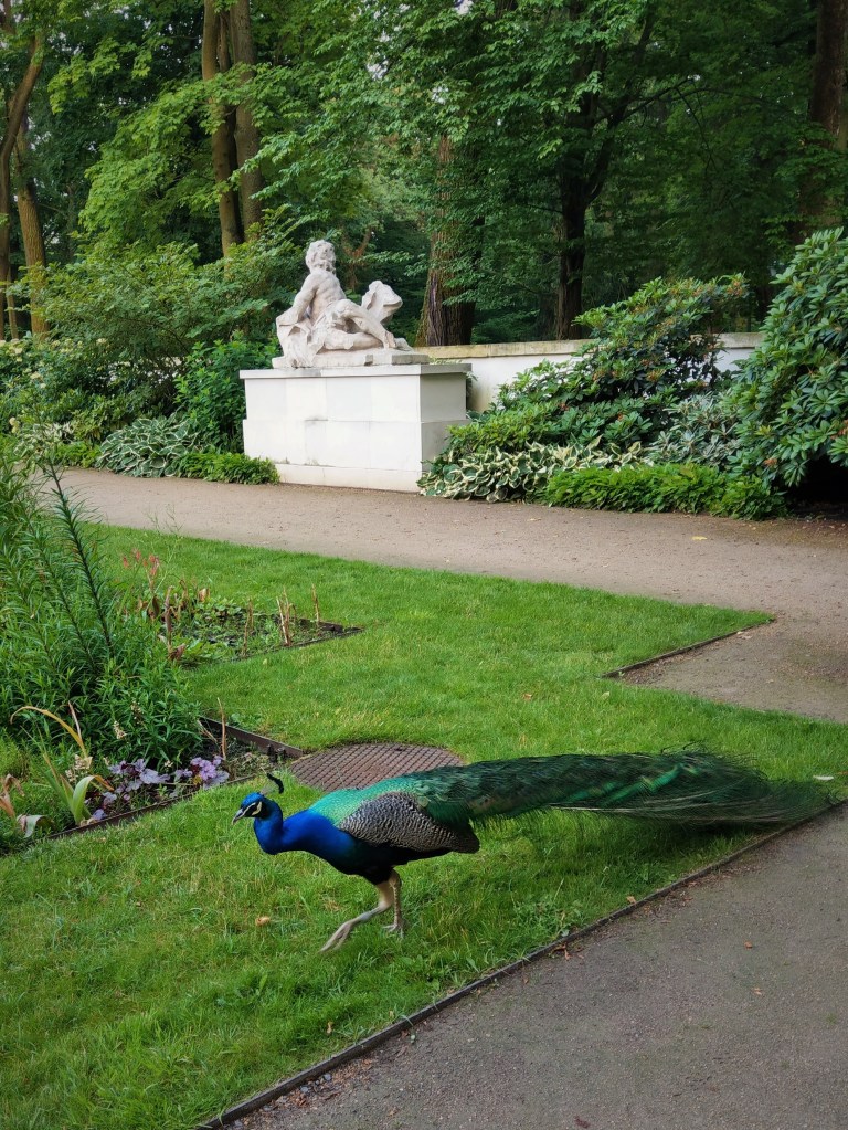 Paw w ogrodzie holenderskim przed Starą Pomarańczarnią.