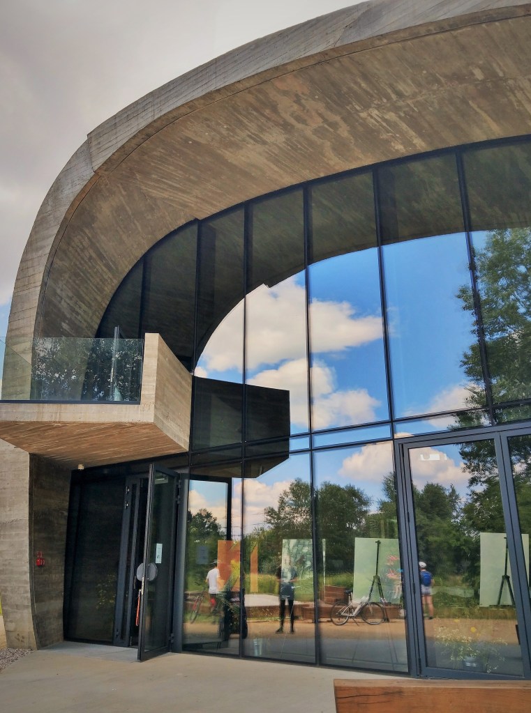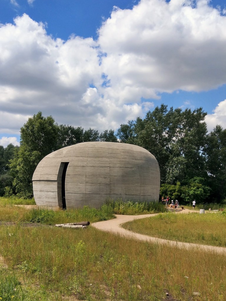 U wejścia na szlak wita nas dość nietypowa budowla. Odbywają się tu różne wydarzenia edukacyjne – wystawy, prelekcje, warsztaty itp. poświęcone ekologii. W kwietniu wisiały tu zdjęcia z wystawy o zwierzętach w mieście (coś dla mnie). Dzisiaj nic się nie działo, ale podobno od wtorku ma się coś zacząć. Cementowa bryła budynku, nagradzana w konkursach architektonicznych, nawiązuje do ekologicznej funkcji. Przypomina wiślane kamienie, o których jeszcze będzie w dalszej części wpisu.