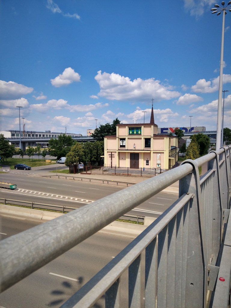 Usytuowany w przedziwnym miejscu – w samym środku skrzyżowania Trasy Toruńskiej z ul. Modlińską i Jagiellońską, pomiędzy wiaduktami.