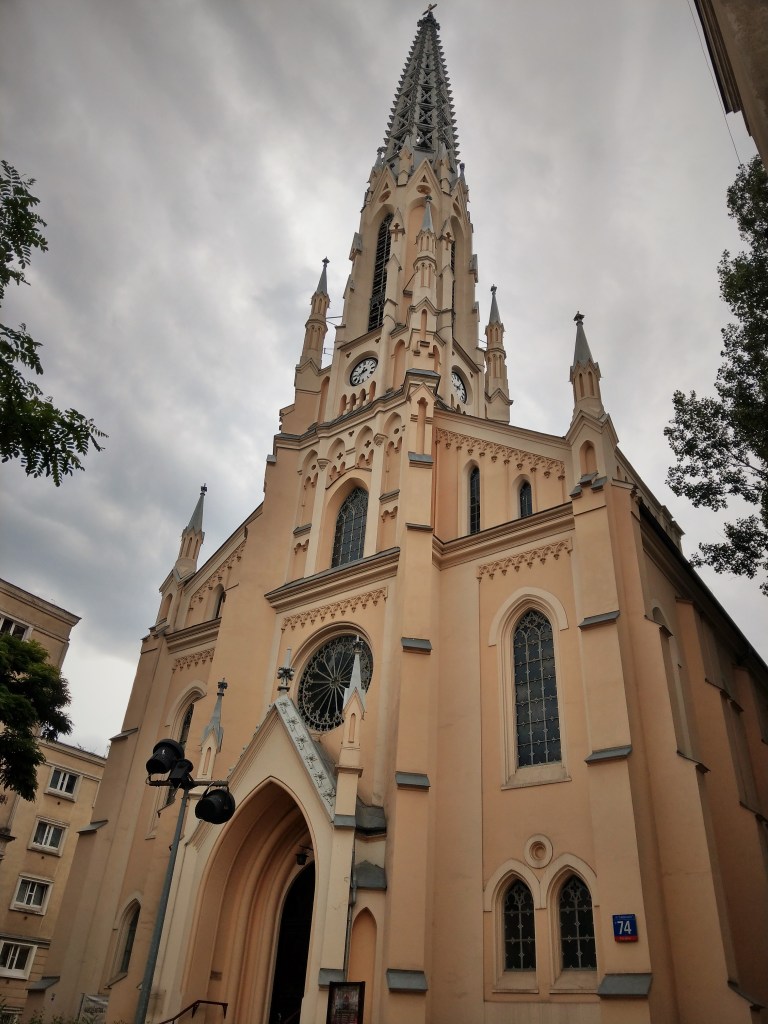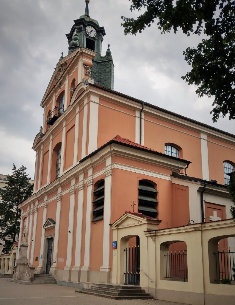 Tzw. „kościół przesuwny”. Pewnej jesiennej nocy 1962 r., w związku z poszerzaniem ul. Leszno, przesunięto go o 21 m na północ. Miejsce dawnej lokalizacji jest zaznaczone na chodniku (na zdjęciu słabo widoczna jasna linia u dołu). Nie bardzo sobie potrafię wyobrazić to przesuwanie, jednak fakt jest faktem.
