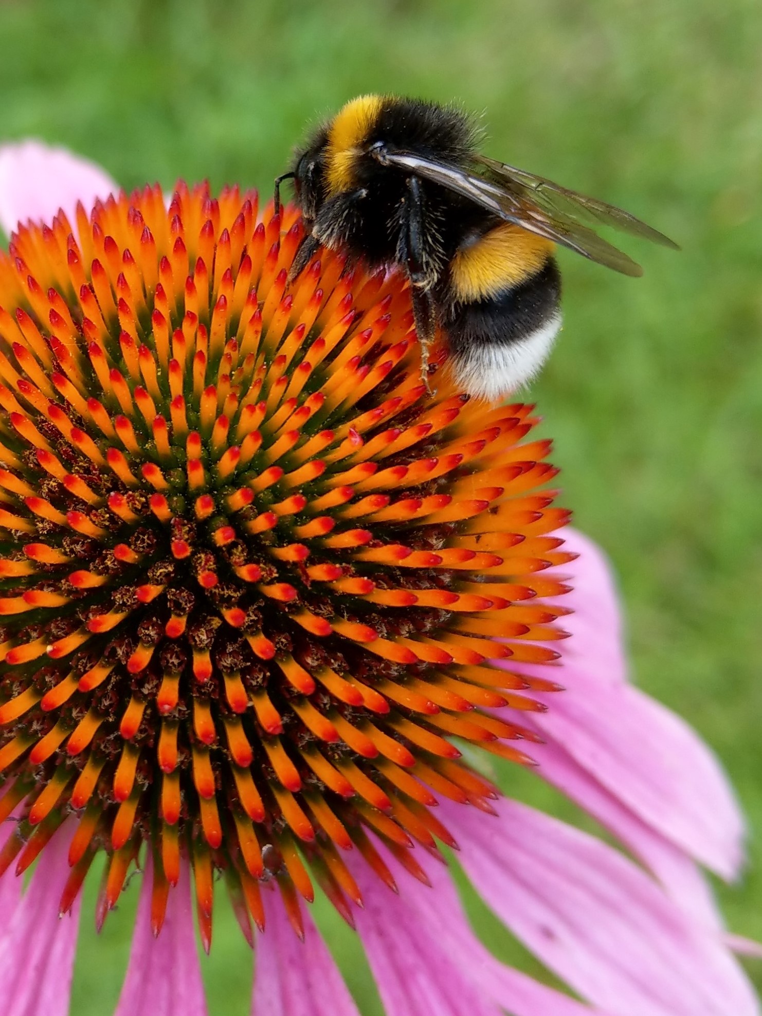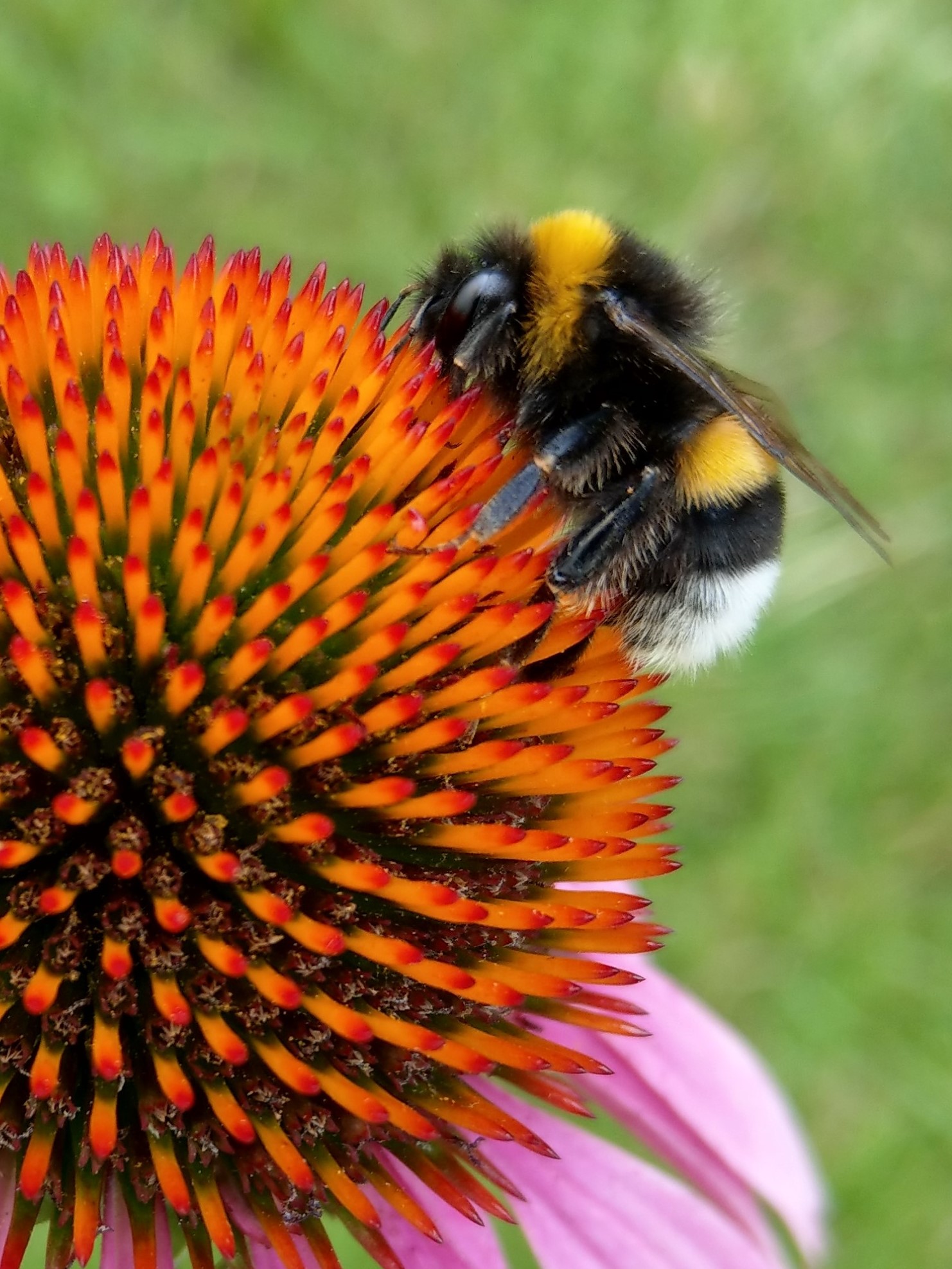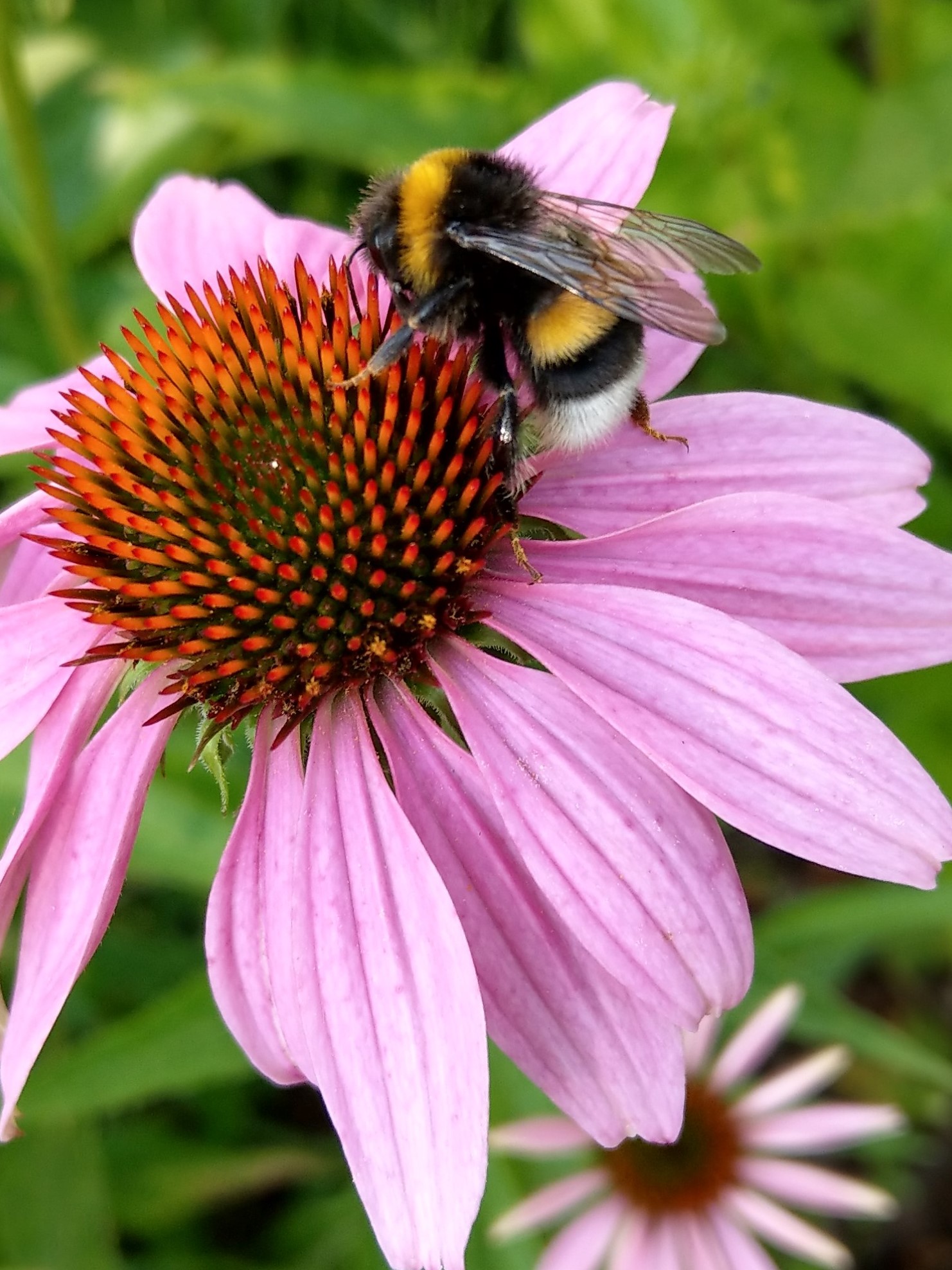 Puchaty taki, że aż się chce go pogłaskać po tym futerku. Preferuje jeżówki, inne kwiaty go właściwie nie interesują, czasem przysiądzie na oregano, czasem na lawendzie, ale natychmiast wraca na swoje ulubione kwiatki. I z kwiatka na kwiatek, z kwiatka na kwiatek… Śledzenie go nudzi się po kilku minutach, bo właściwie nic innego nie robi, tylko je, je i je… Z rusałką pawikiem jest w dobrej komitywie, nie przeszkadza mu. Czasem tylko mruknie pod nosem: „weź się trochę posuń…”