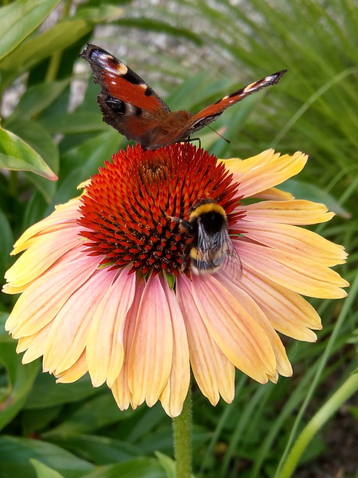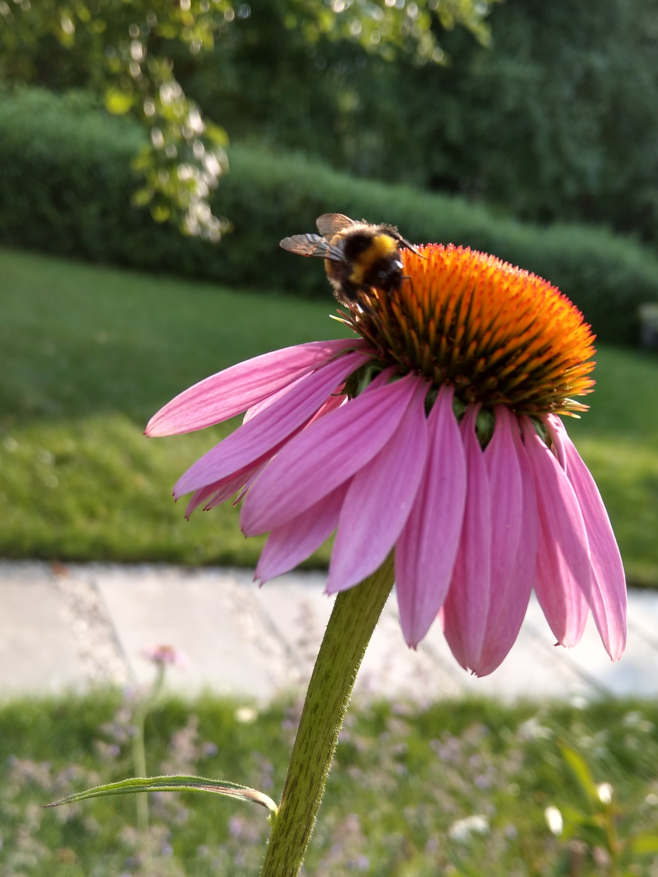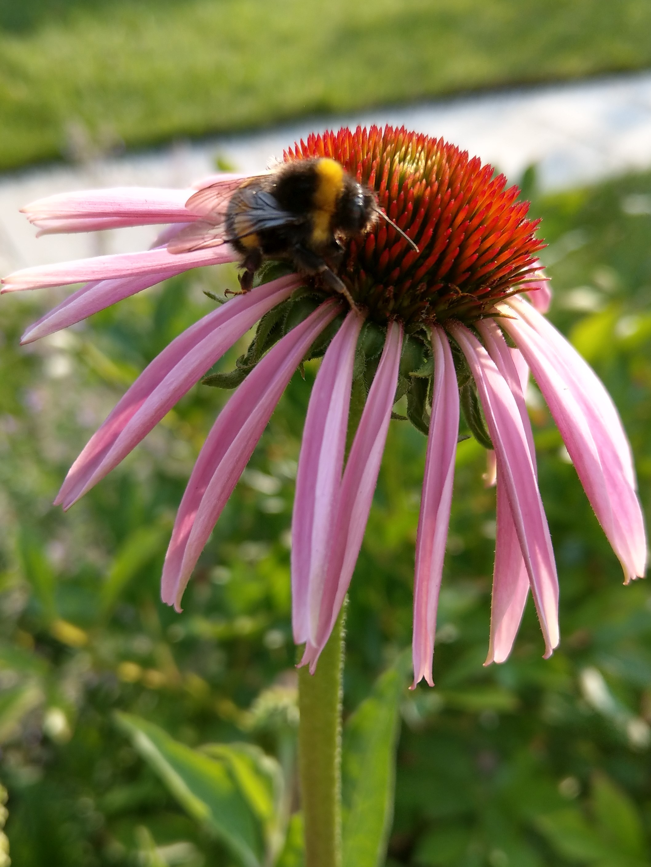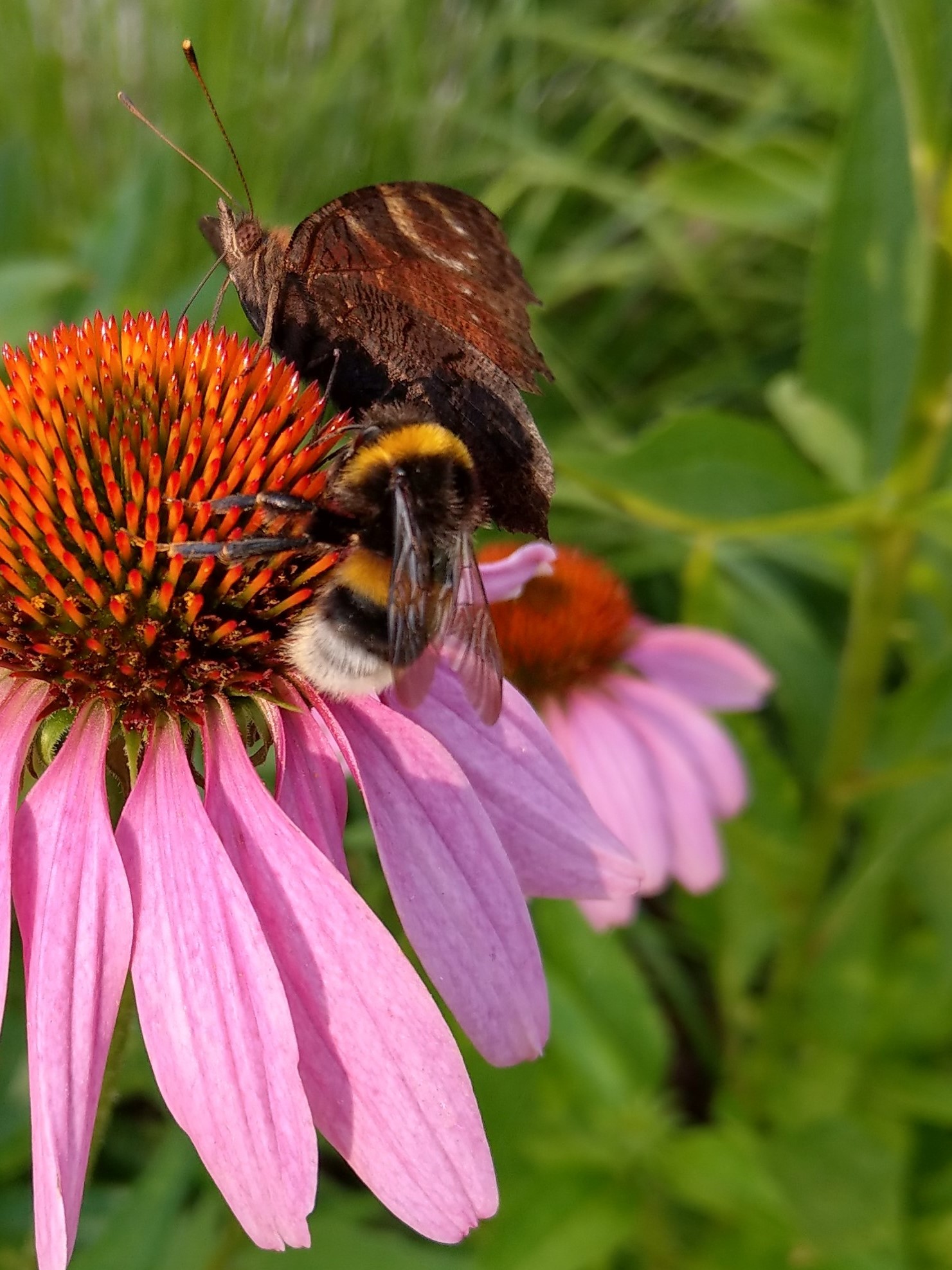 Puchaty taki, że aż się chce go pogłaskać po tym futerku. Preferuje jeżówki, inne kwiaty go właściwie nie interesują, czasem przysiądzie na oregano, czasem na lawendzie, ale natychmiast wraca na swoje ulubione kwiatki. I z kwiatka na kwiatek, z kwiatka na kwiatek… Śledzenie go nudzi się po kilku minutach, bo właściwie nic innego nie robi, tylko je, je i je… Z rusałką pawikiem jest w dobrej komitywie, nie przeszkadza mu. Czasem tylko mruknie pod nosem: „weź się trochę posuń…”