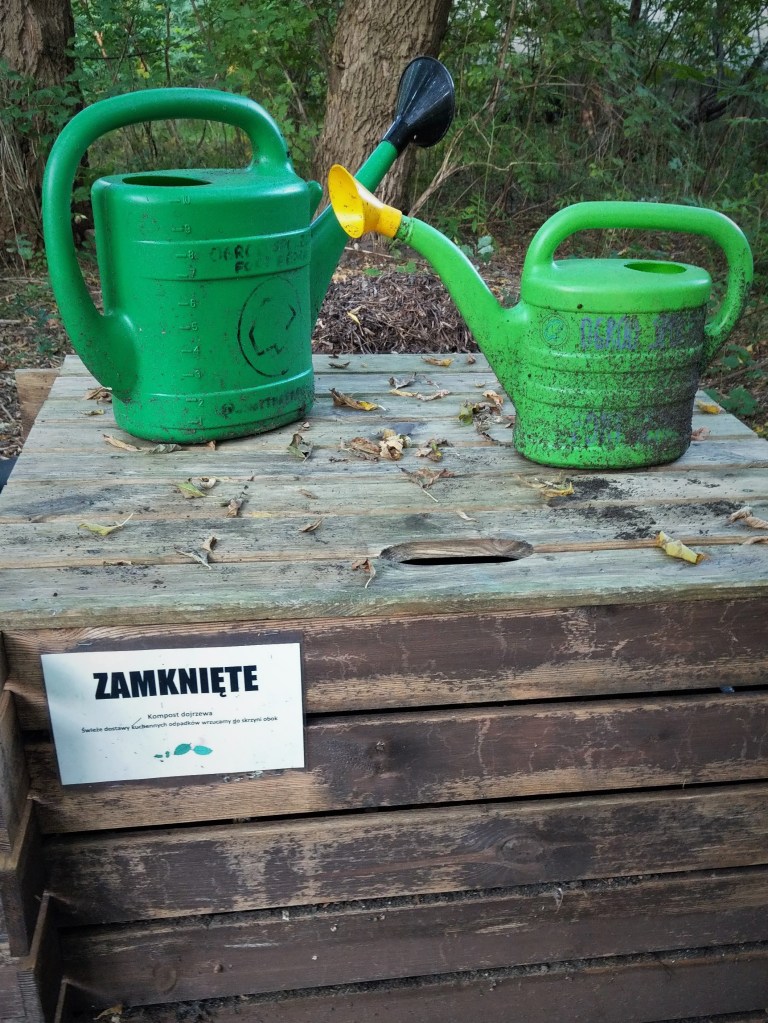 Napis na tym głosi, że „kompost dojrzewa. Świeże dostawy kuchennych odpadków wrzucamy do skrzyni obok”. Zajrzałam do tej drugiej skrzyni, trochę odpadków faktycznie w niej było, choć nie za dużo.