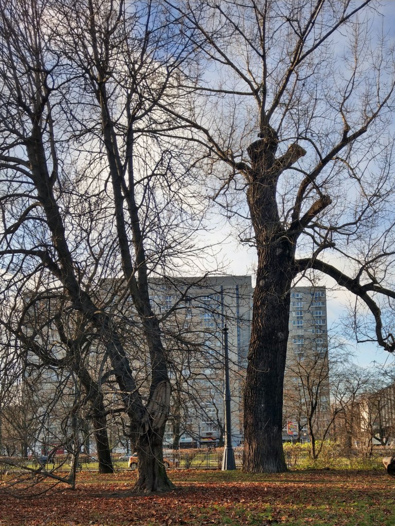 Jeden z pomników przyrody Ogrodu Saskiego (topola biała). W tle mrówkowiec Osiedla Za Żelazną Bramą po zachodniej stronie Marszałkowskiej.