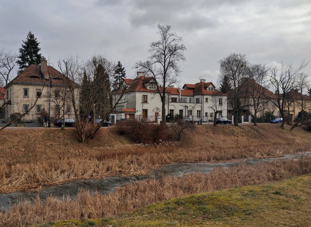 Za fosą widoczne przedwojenne oficerskie osiedle na Sadybie, rozplanowane według angielskiej idei miasta-ogrodu.