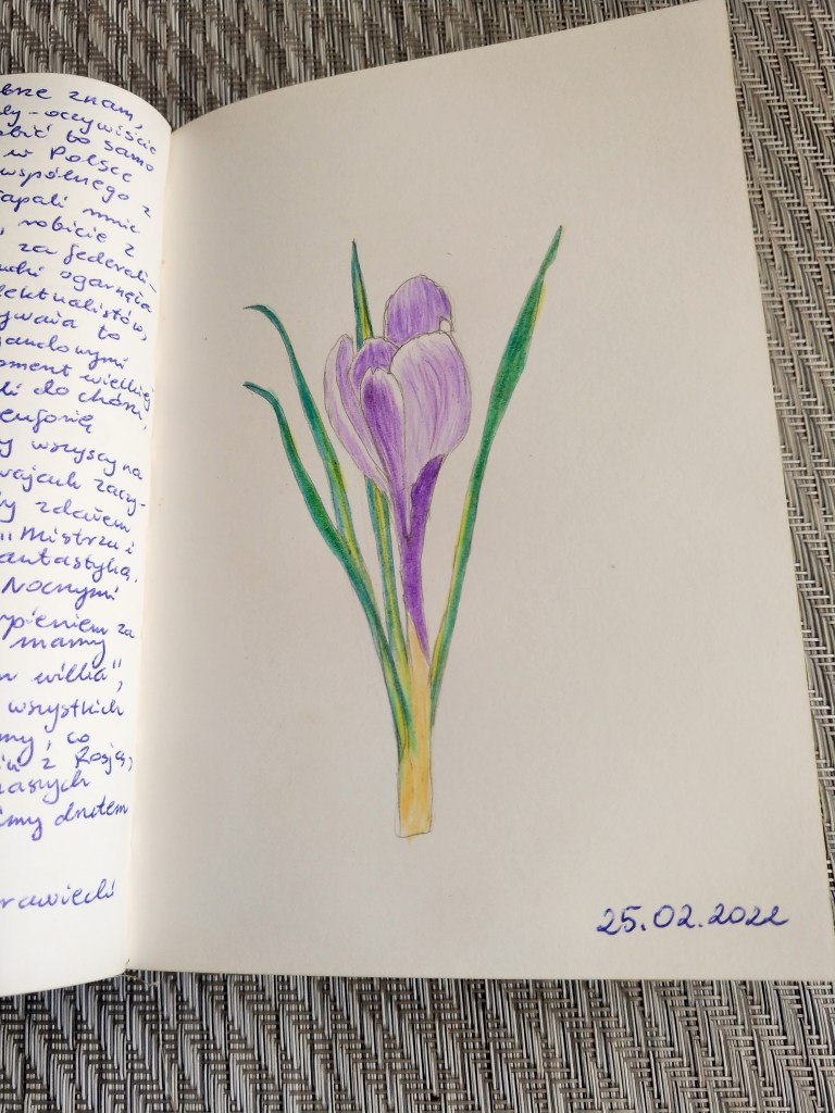 Przebiśniegi rysowałam w ubiegłym roku, więc w tym – inny wiosenny kwiatek. Nie z natury co prawda, bo jeszcze nie kwitną.