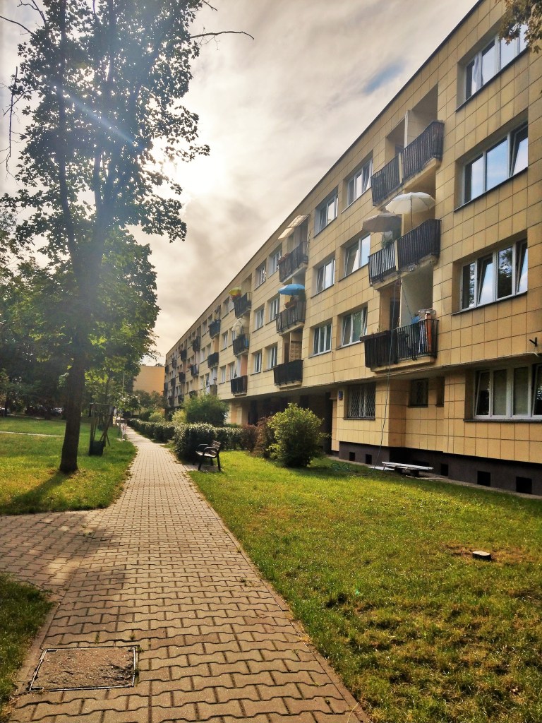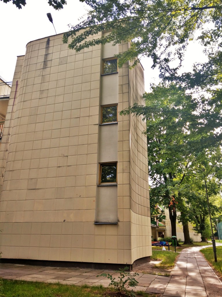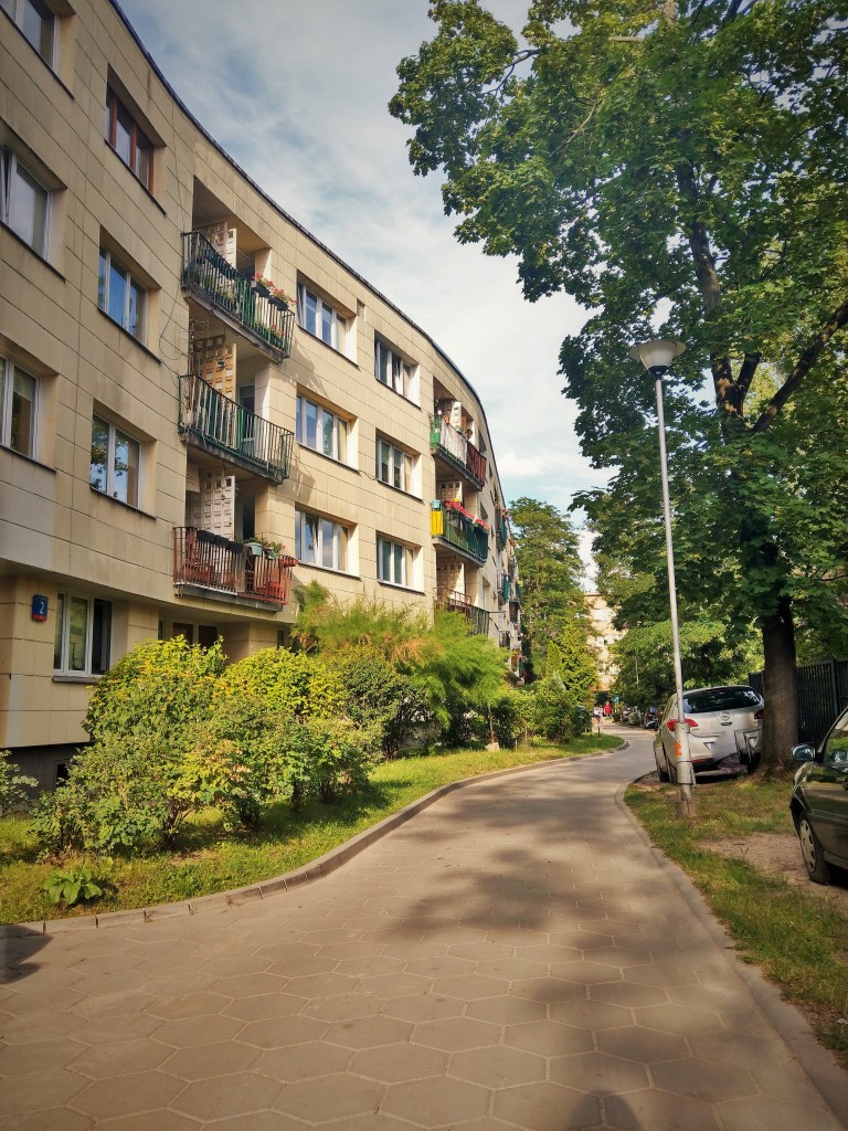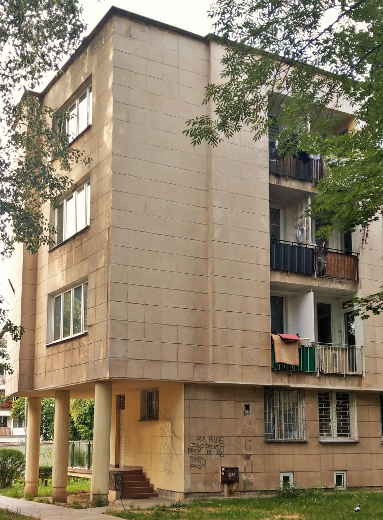 Po drugiej stronie ul. Obozowej, naprzeciwko osiedla TOR, leży osiedle powojenne (z lat 1947-50), które wygląda jak przedwojenne (może nawet bardziej niż to pierwsze). Zaprojektowało je bowiem małżeństwo – Helena i Szymon Syrkusowie – przedstawiciele przedwojennej, architektonicznej awangardy. Od 2008 r. osiedle figuruje w rejestrze zabytków. Bardzo tu „lecorbusierowsko”. I bardzo ładnie. Moim zdaniem jedno z najładniejszych osiedli nie tylko na Woli, ale i w Warszawie. Szkoda, że wybrałam się na nie o nie najlepszej godzinie i zdjęcia wyszły takie sobie.