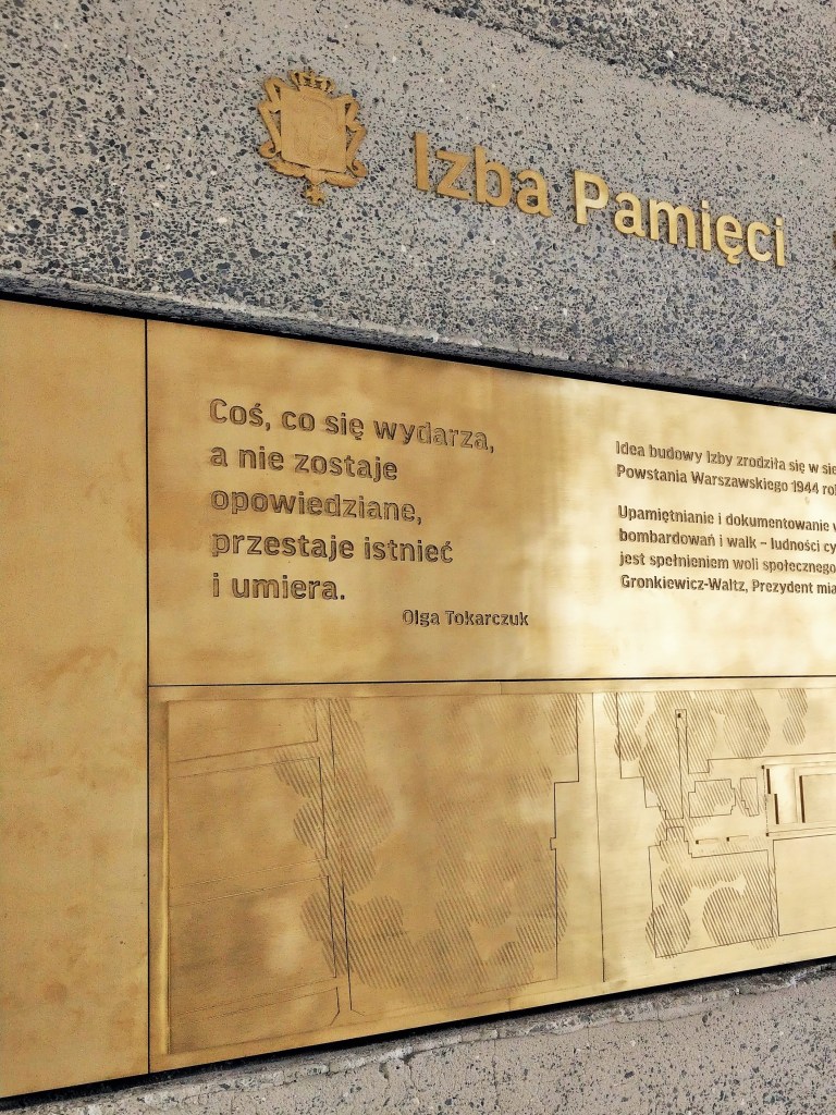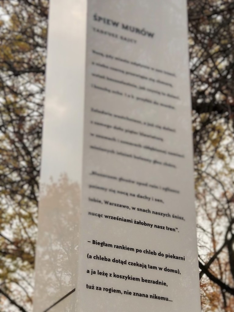 Białe, szklane podświetlane słupy to ekspozycja Muzeum Powstania Warszawskiego, montowana wiosną i demontowana jesienią, na której znajduje się 50 tys. imion i nazwisk oraz dat urodzenia ofiar Powstania Warszawskiego.