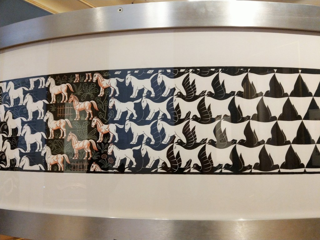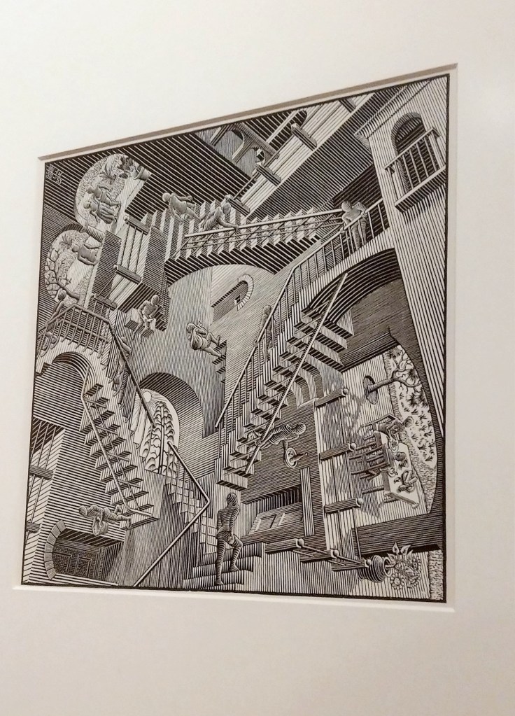 Maurits Cornelis Escher (1898 – 1972) – holenderski malarz i grafik, który w swojej twórczości połączył matematykę ze sztuką. Jego rysunki potrafią zahipnotyzować (a także przyprawić architektów o ból głowy). W haskim muzeum można obejrzeć wszystkie jego najbardziej znane prace, a także samemu trochę się pobawić perspektywą, np. zrobić sobie z koleżanką/kolegą z pracy zdjęcie, na którym kolega/koleżanka wygląda przy nas jak liliput (lub jak Guliwer). Oczywiście skorzystałyśmy z koleżanką z tej okazji, ale ponieważ na zdjęciu widnieją nasze oblicza, to nie publikuję.