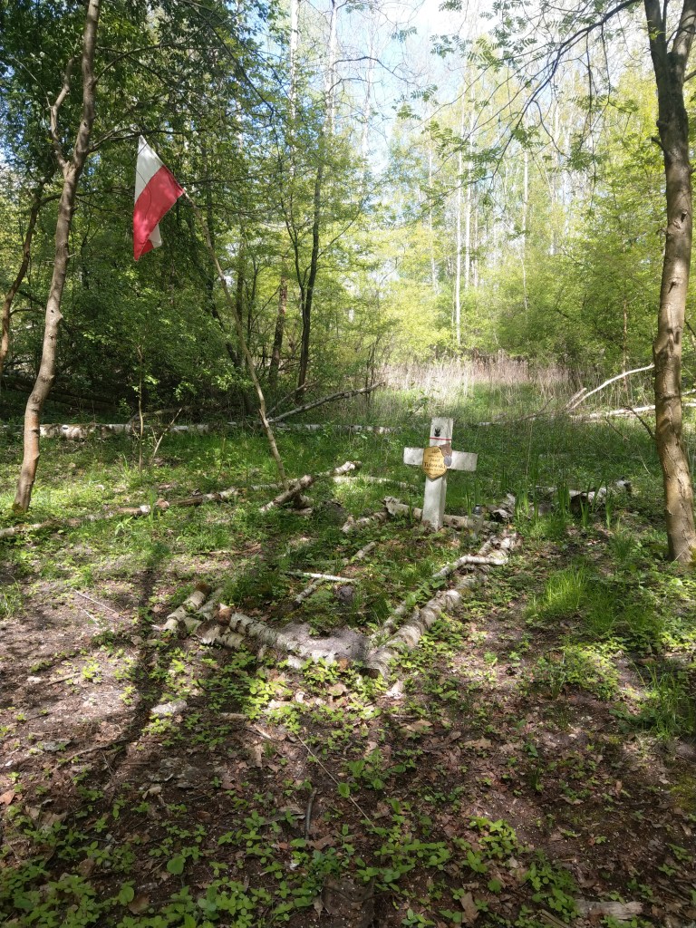 Tego grobu żołnierza z września 1939 r. nie dałoby się znaleźć bez tej flagi (albo bez smartfona z nawigacją) – nie prowadzi do niego żadna ścieżka, trzeba się do niego przedrzeć przez powalone pnie i pokrzywy. Ale co to dla mnie.
