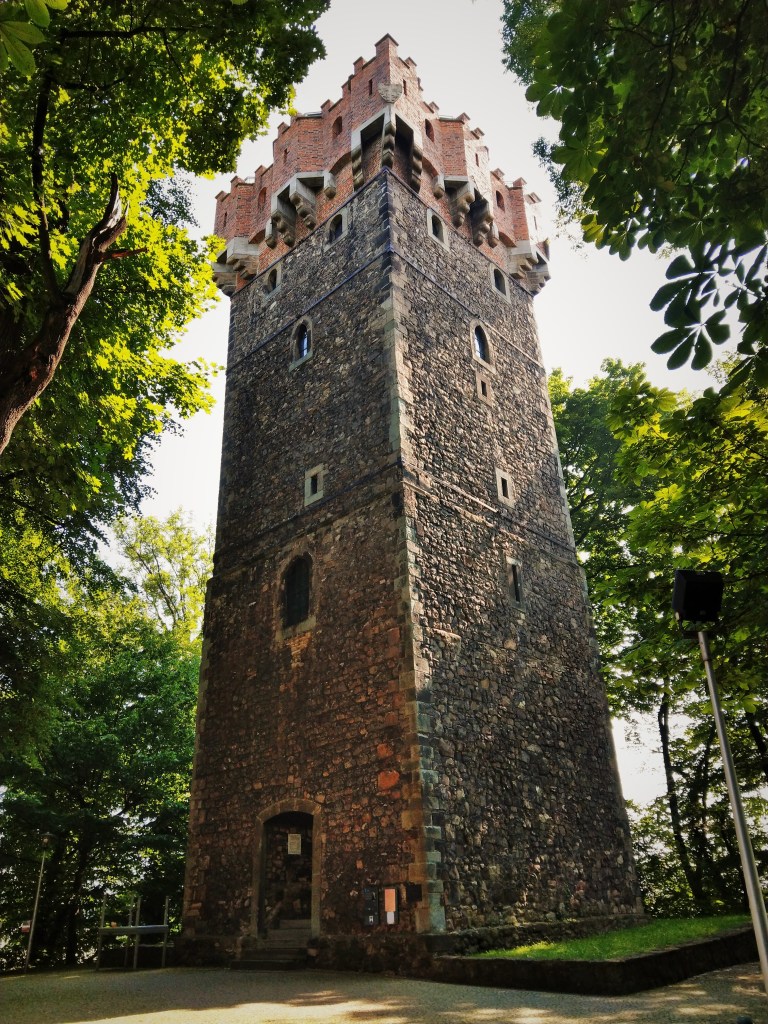Na szczycie widoczny (ledwie) orzeł piastowski. Można na nią wejść – po 120 stopniach – by podziwiać panoramę Cieszyna.