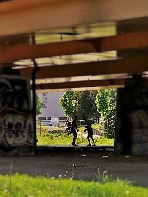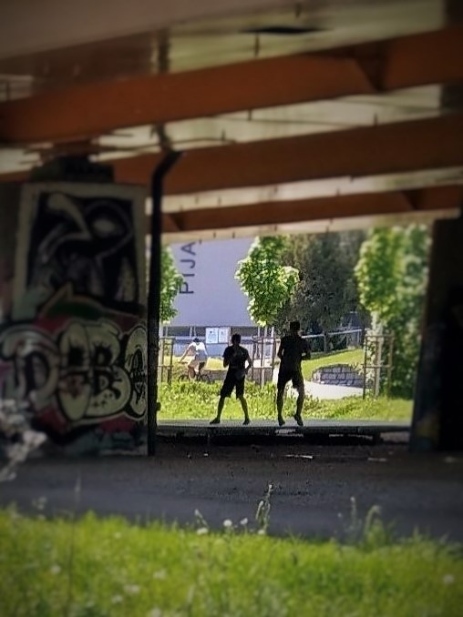 Można tu też oberwać w gębę, bo pod mostem urządzono plac z urządzeniami do ćwiczeń wraz z ringiem bokserskim. Chłopcy w rękawicach bokserskich wdzięcznie na nim podskakują. Waga piórkowa zdaje się.