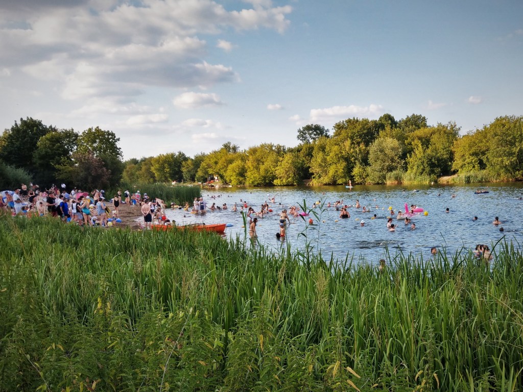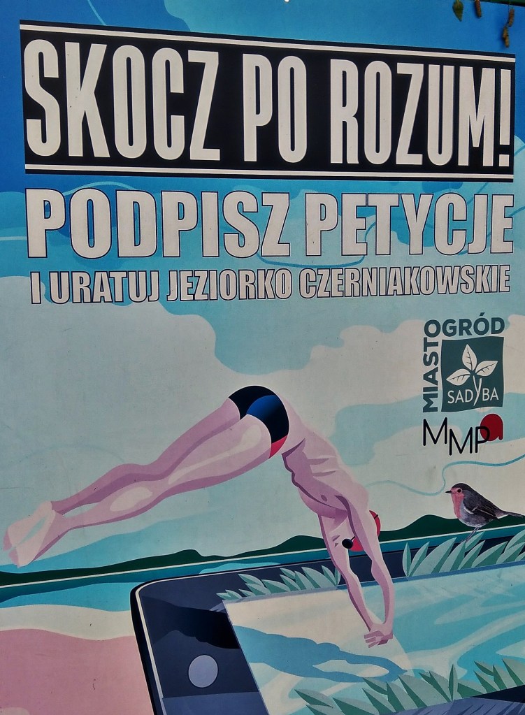 Kąpielisko nad Jeziorkiem Czerniakowskim jest jedynym w Warszawie kąpieliskiem zgodnym z wymogami unijnej dyrektywy kąpieliskowej i – jak widać – cieszy się dużym powodzeniem (głównie wśród Ukraińców – takie przynajmniej odniosłam wrażenie). Sezon kąpielowy – od 9 czerwca do 15 września. Długość linii brzegowej – 30 m. Zdatność wody do kąpieli jest regularnie badana i dzisiaj wywieszona była biała flaga. Są przebieralnie, toalety, jest ratownik i lodziarnia jest. Nie ma tylko gdzie położyć kocyka :-). Chętnie bym sobie popływała (strasznie dawno nigdzie nie pływałam, a w jeziorze to w ogóle chyba nigdy), ale nie miał mi kto popilnować rzeczy.