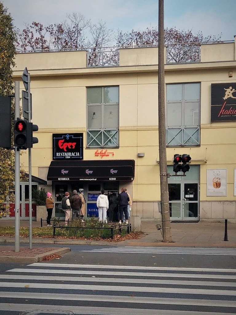 Kolejka stoi do okienka z kebabami tureckiej restauracji Efes (filii restauracji na Saskiej Kępie). Tutejsze kebaby uchodzą za najlepsze w Warszawie, są z baraniną i kolejka po nie stoi tu zawsze. Jadłam je wielokrotnie i potwierdzam – są naprawdę smaczne. W samej restauracji też dobrze karmią.
