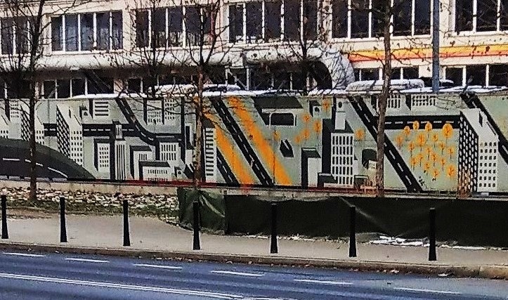 Jedyne działające tutaj nadal zakłady „przemysłowe” to zajezdnie – tramwajowa i autobusowa z lat 50. Na płocie mural warszawski – można rozpoznać Pałac Kultury, rotundę, dworzec centralny i bloki Osiedla Za Żelazną Bramą. Oprócz tego dużo pustych ulic i – co trochę dziwne – tylko jeden autobus.