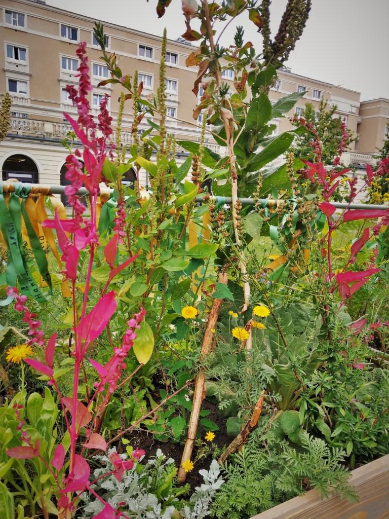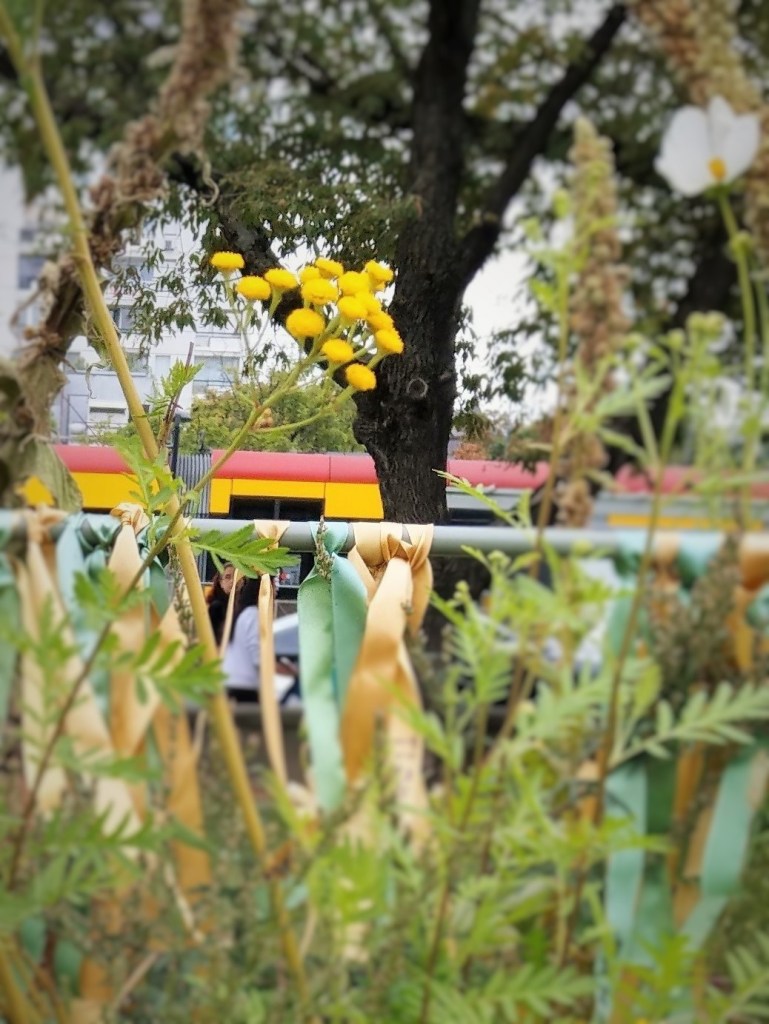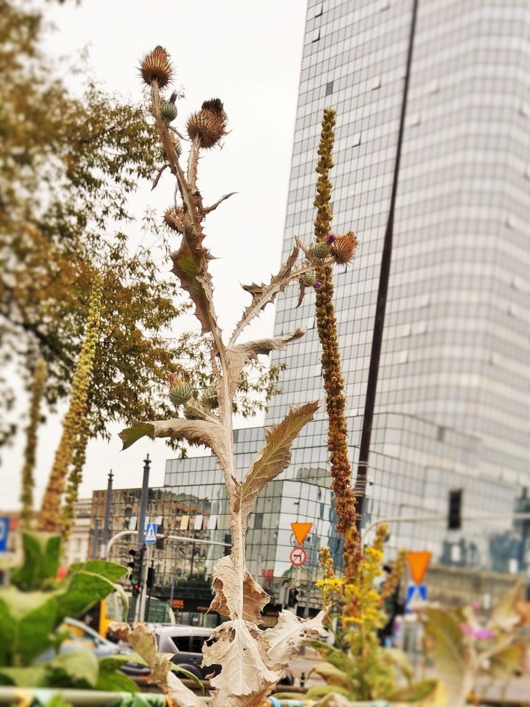 Ponieważ przyjechałam trochę przed czasem, czekając pokręciłam się chwilę przed kinem i natknęłam na wystawę plenerową – historyczno-botaniczną: „Korzenie powstania. Opór w getcie warszawskim”. Wystawa ma postać kilku dużych pojemników, zasadzonych chwastami i opatrzonych zdjęciami żydowskich członków ruchu oporu, wraz z opisem ich działalności. Są też krótkie informacje dotyczące ważnych chwil w historii getta, jak np. akcji jego likwidacji. Chwasty nie są przypadkowe, są to gatunki ruderalne, odnalezione na ruinach getta i skatalogowane przez prof. Romana Kobendzę, botanika związanego m.in. z Ogrodem Botanicznym UW. Jak wiadomo, jestem miłośniczką chwastów wszelakich, a ruderalnych w szczególności, więc ten sposób upamiętnienia zagłady dzielnicy żydowskiej bardzo mi przypadł do gustu. Zatem parę fotek z tej oryginalnej wystawy: