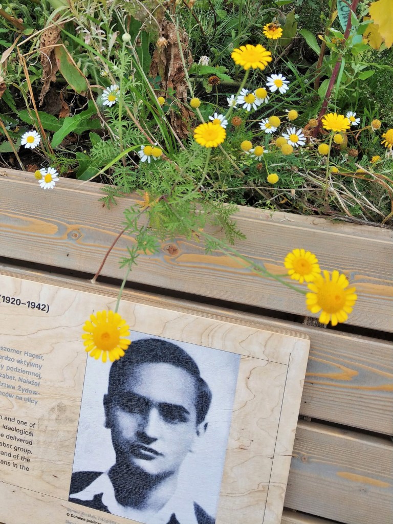 Tutaj mam problem – te białe to rumianki, ale te żółte? Podobnych żółtych kwiatków jest całe mnóstwo, nie potrafię ich zidentyfikować. Mężczyzna na zdjęciu to Szmuel Bresław, działacz żydowskiej organizacji młodzieżowej.