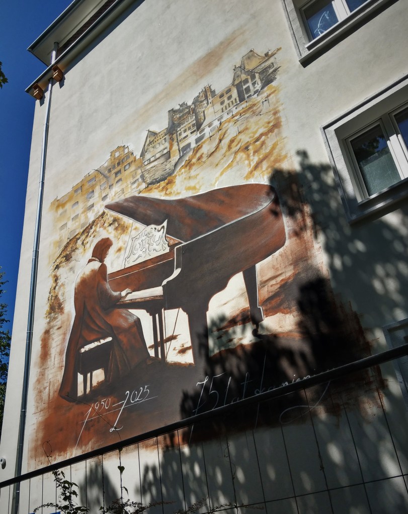 Większość domów jest z lat 30-tych, ale są i młodsze, ten jest z 1950. Mural kojarzy mi się z Władysławem Szpilmanem, grającym na warszawskich popowstańczych gruzach, ale nie wiem, czy ma z nim coś wspólnego. Na tym odcinku Wiktorskiej jest też kilka sklepów muzycznych, można kupić bębny, pianina, gitary, instrumenty dęte a nawet fortepian.