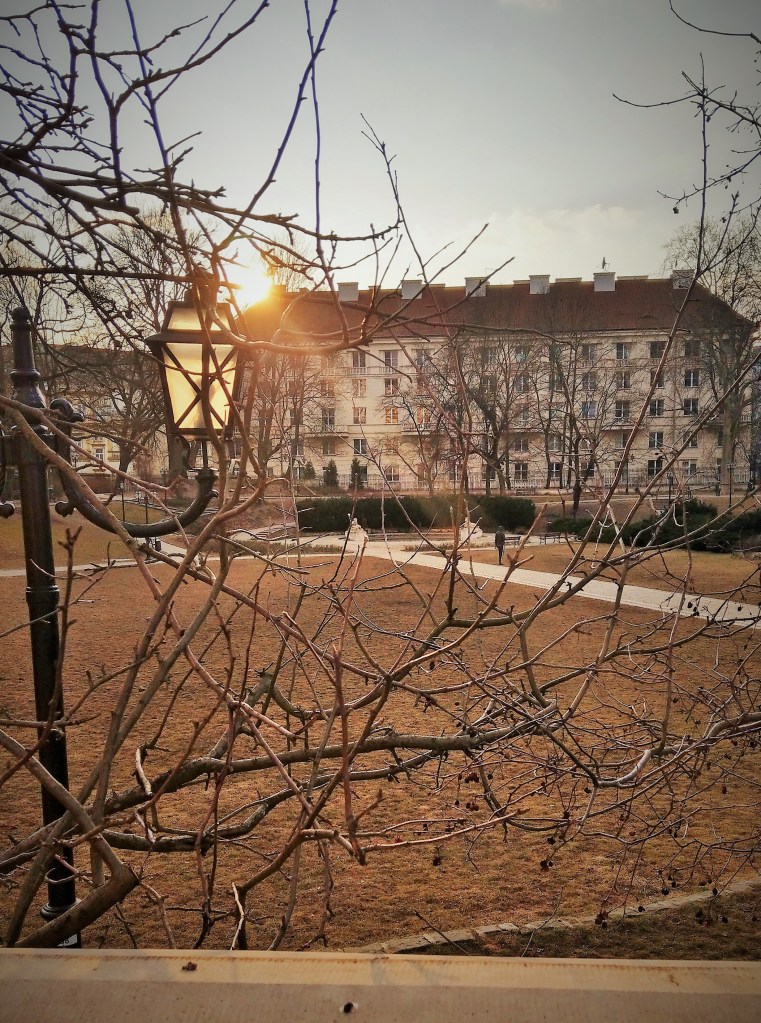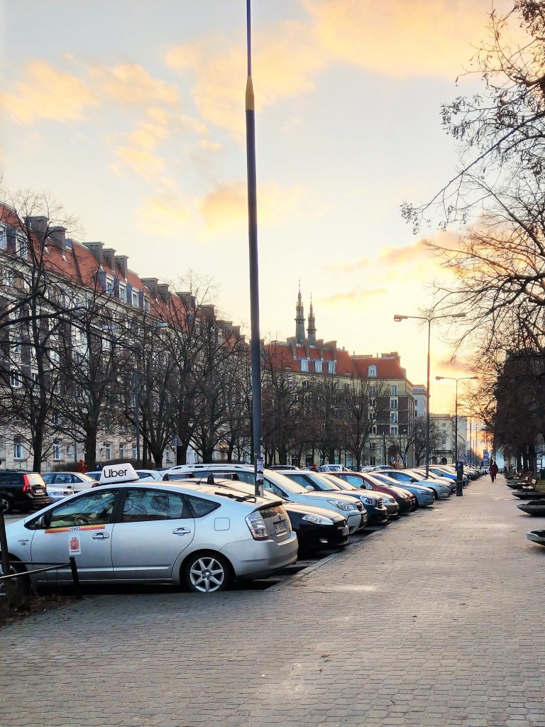 ul. Wilcza w ostatnich promieniach zachodzącego słońca.