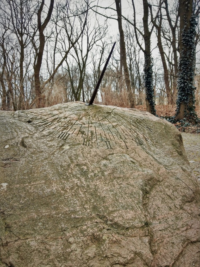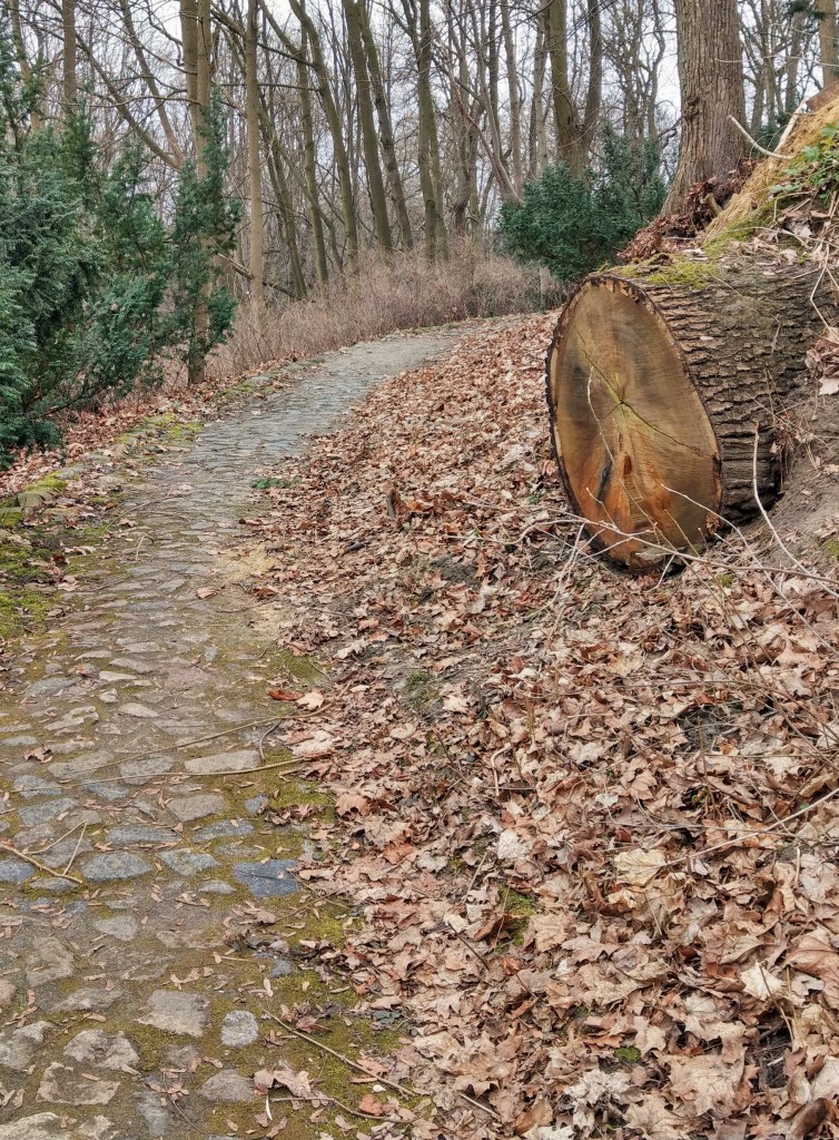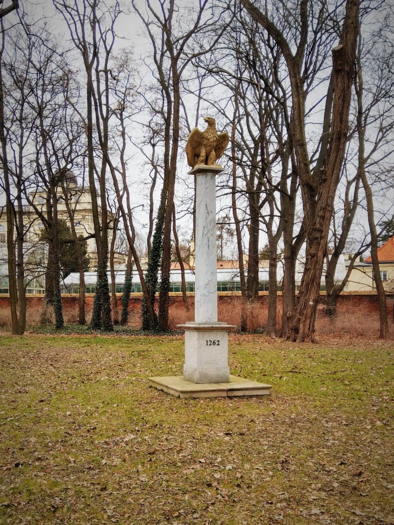 Kolumna z orłem w mało znanym zakamarku na górce przy Starej Oranżerii. W tle stare obserwatorium astronomiczne przy ogrodzie botanicznym.