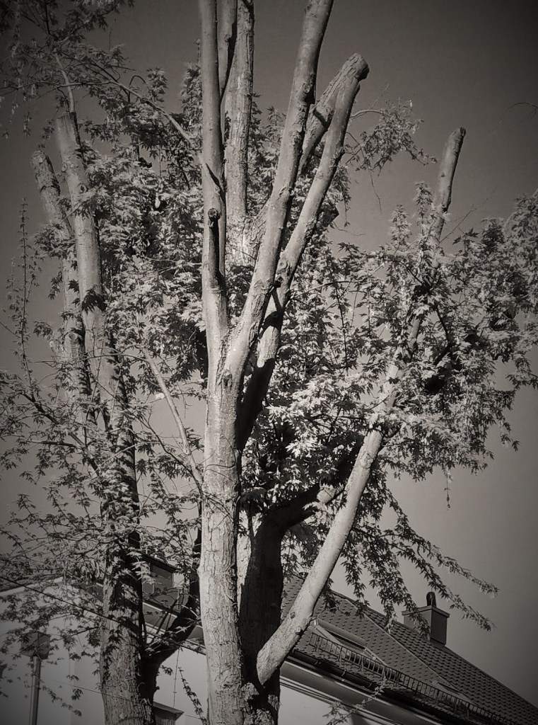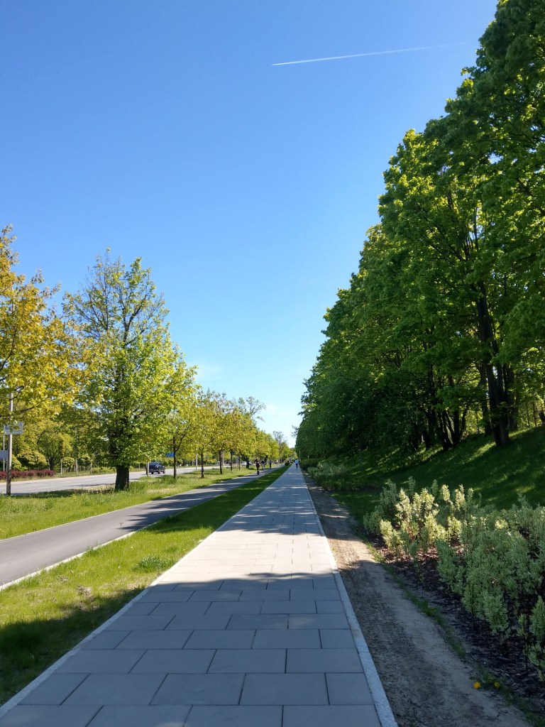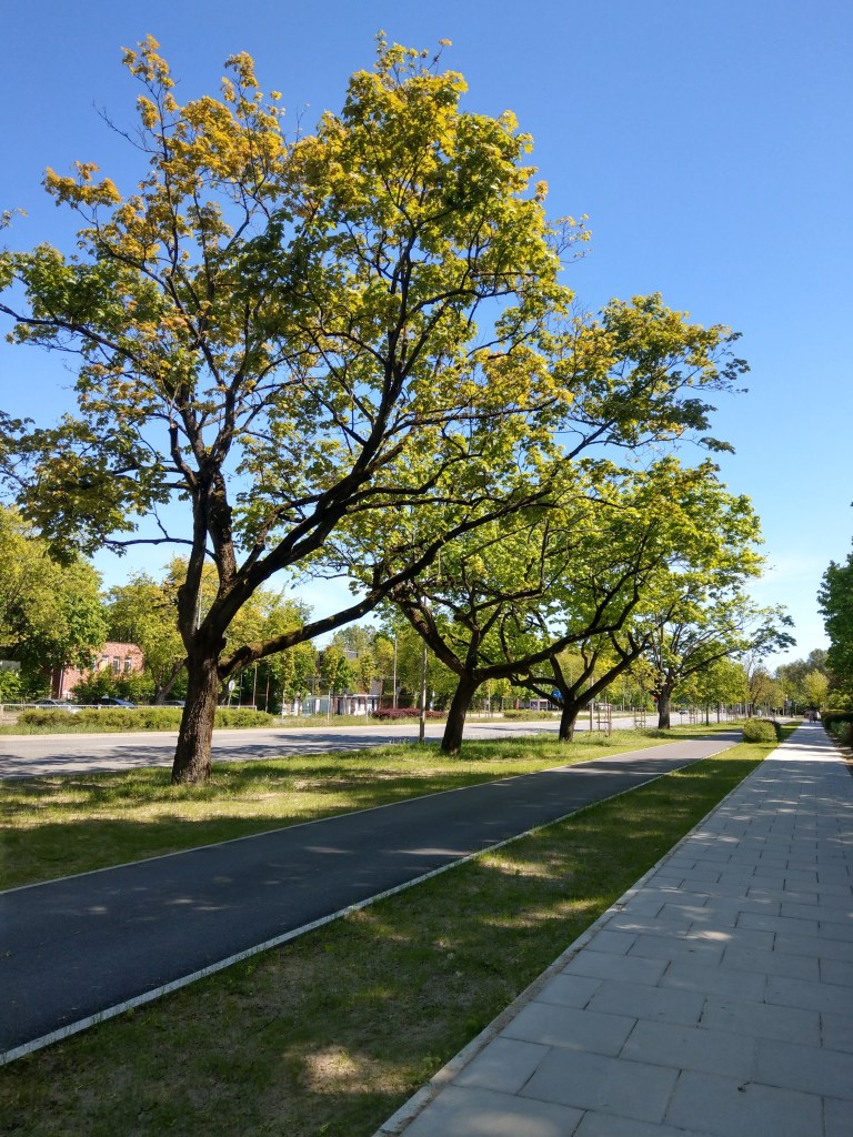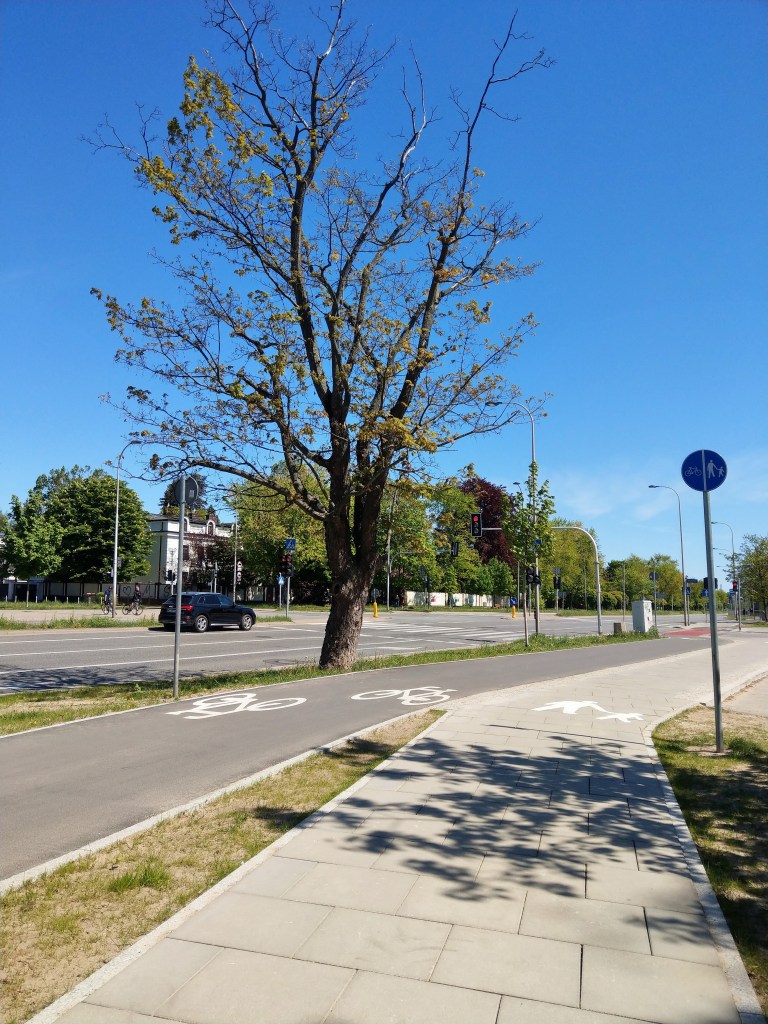 Ul. Racławicka była węższa, nie było chodnika i ścieżki rowerowej, jedynie wydeptana ścieżka pośrodku, w cieniu rozłożystych klonów. Stare klony wycięto lub same w trakcie tej przebudowy uschły, w ich miejsce posadzono nowe drzewa, ale dopiero rosną. Są na szczęście drzewa po prawej – bronią dostępu do twier… tfu – osiedla Marina Mokotów, największego zamkniętego osiedla w Warszawie, miasta w mieście prawie – ale kiedyś cienia było jeszcze więcej.