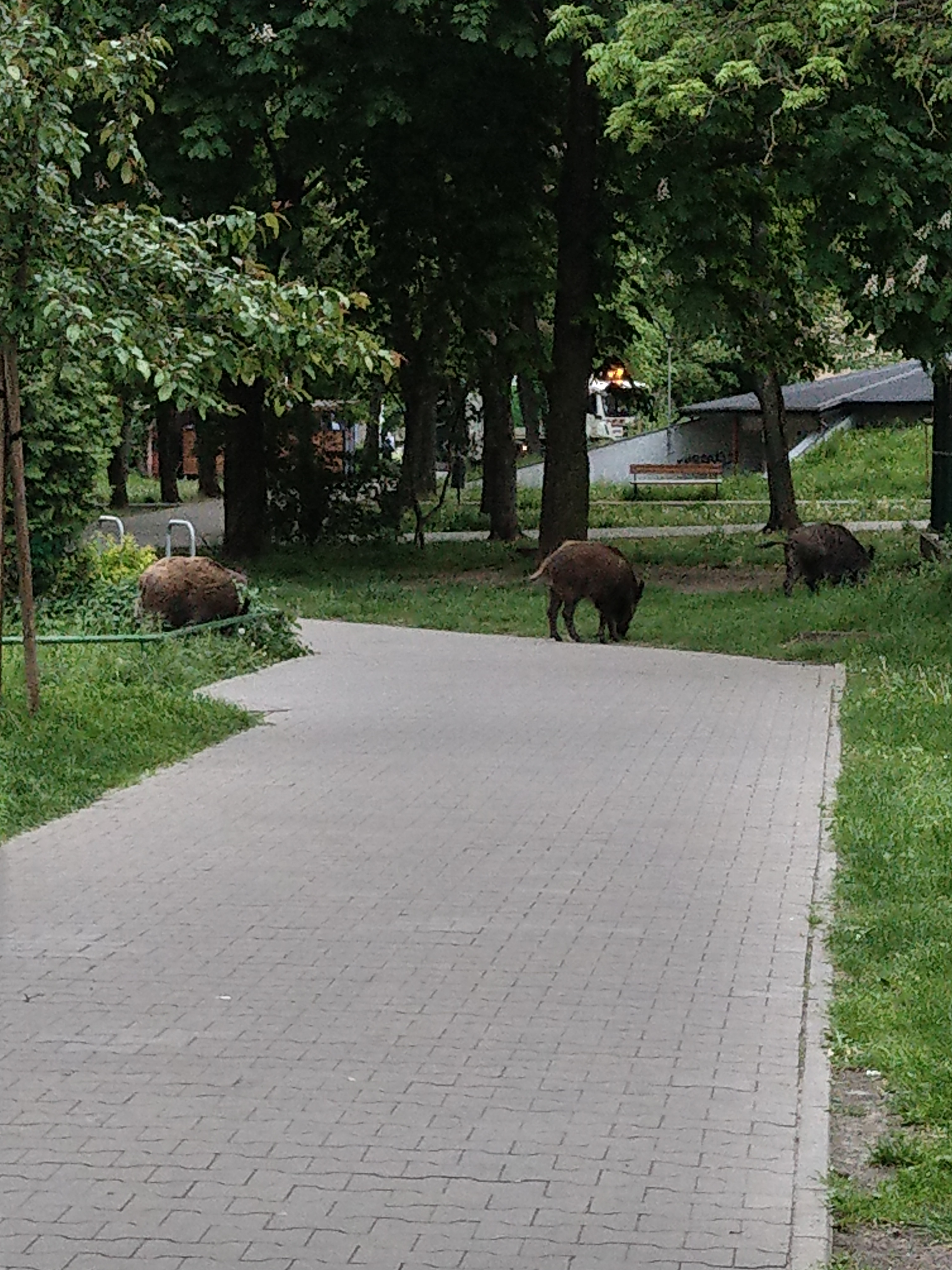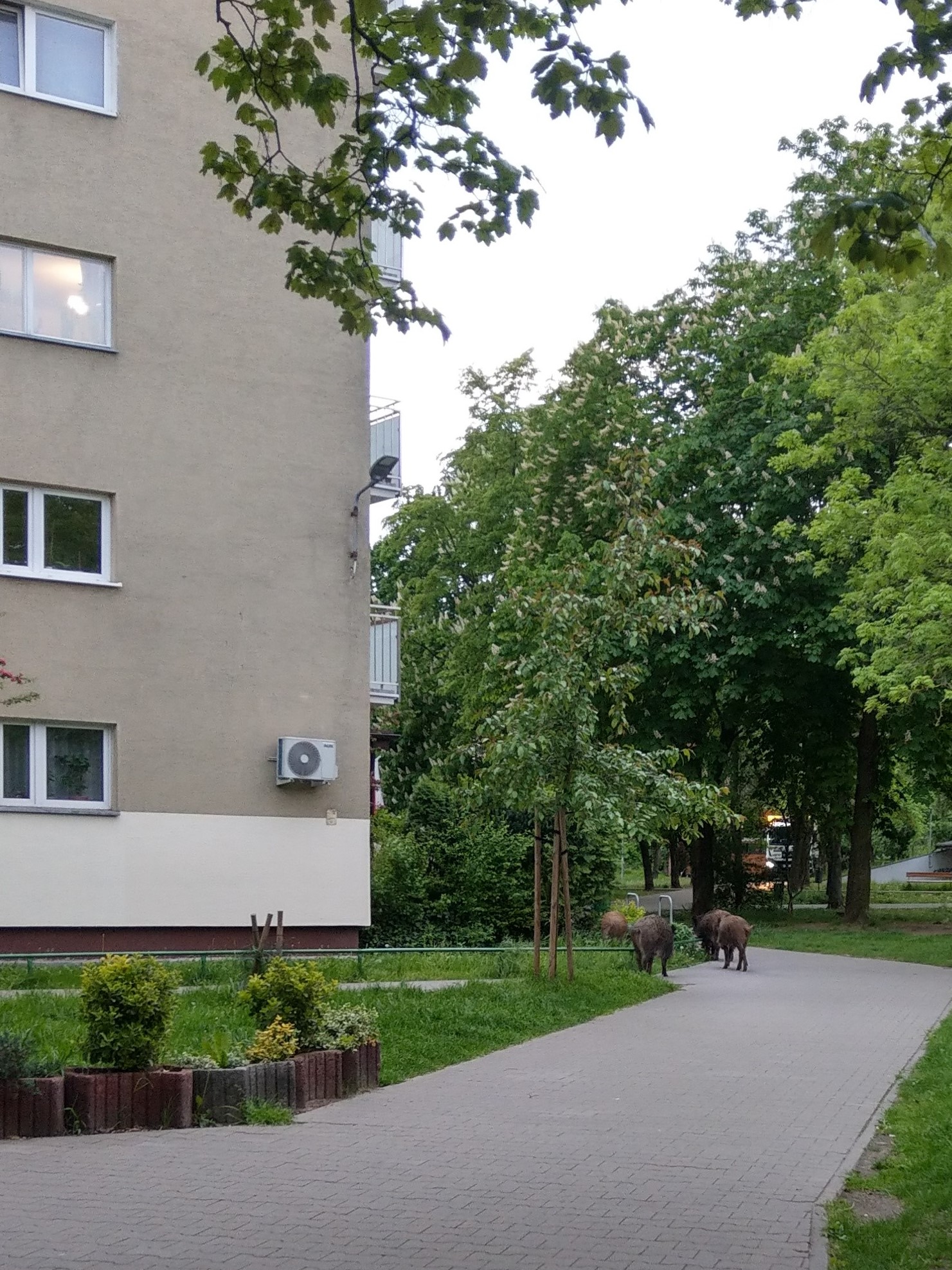 Godz. 19:30, dziki idą w stronę przystanku tramwajowego… :-). Zachowuję spokój i nie wykonuję gwałtownych ruchów.