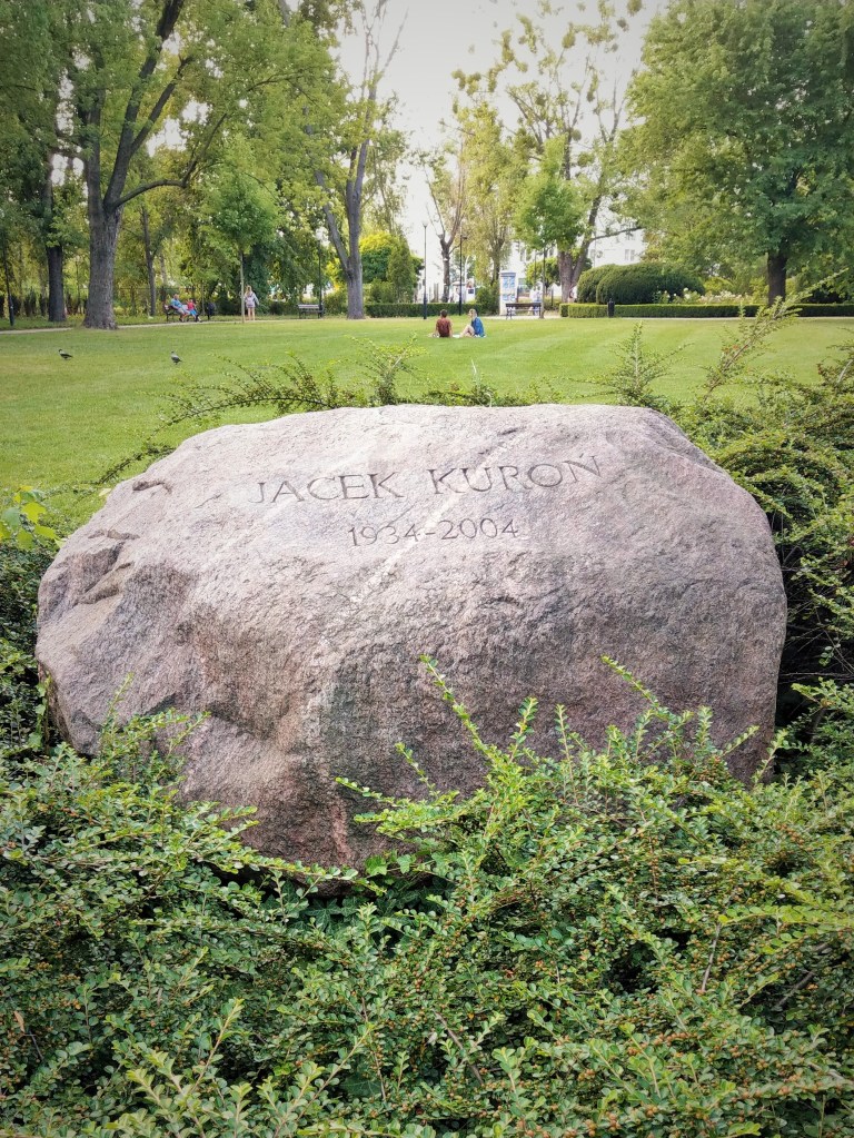 Kamień upamiętniający Jacka Kuronia, leżący w odległości kilkudziesięciu metrów od mieszkania na Mickiewicza, w którym rzeczony knuł przeciwko komunie. Może i dobrze, że nie dożył dzisiejszych czasów, bo raczej nie o taką Polskę walczył.